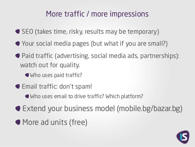 partnerships): watch out for quality. Who uses paid traffic? Email traffic: